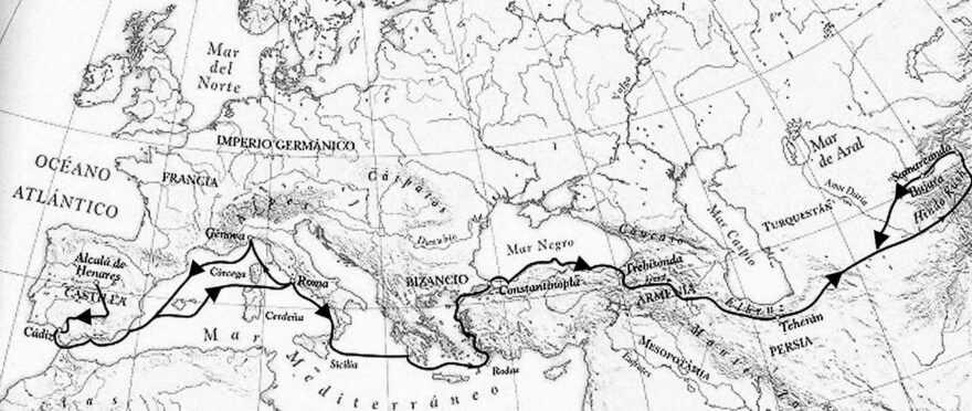 Kadis bir ming bir yuz yil oldin finikiyaliklar tomonidan asos solingan qadimgi port shahar bo'lib, Buyuk geografik kashfiyotlar davrida shu joydan Amerika qit'asiga kemalar yo'l olgan edi. Unga yaqin Palos-de-la-Frontera portidan keyinchalik Xristofor Kolumb yo'lga chiqqan va shu safari davomida jahonshumul kashfiyotni amalga oshirgan, yangi materikni kashf qilgan edi. Qirol elchilari Santa-Mariya portidan kemaga o'tirib, Italiya qirg'oqlaridan suzib, ya'ni Genuya, Piza, Venetsiya shaharlarini ortda qoldirib, Gretsiyaning Rodos shahriga yetib keladilar. Rodos shu oroldagi yirik port edi. Undan keyin Turkiyaning Trabzon portiga borish nasib etgach, yo'lni quruqlikda davom ettiradilar. Ot bilan Arzinjon, Sultoniya, Kunyo, Ray, Tehron, Nishopur, Balx singari Sharqning mashhur shaharlariga qadam qo'yadilar. Nihoyat, bu manzillarni ortda qoldirib, Amudaryodan o'tadilar, tabarruk zamin — Kesh (Shahrisabz)ni ixlos bilan tavof qilib, Oqsaroy mahobatidan hayratlanib, Samarqand sari vosil bo'ladilar. Shunday qilib, ular 1404 yil sentyabrda Samarqandga yetib kelishadi. Qariyb o'n besh oy davom etgan safar ajoyib taassurotlarga boy bo'ladi. Ko'rganlarini Klavixo kundalik tariqasida qayd qilib borgan edi.