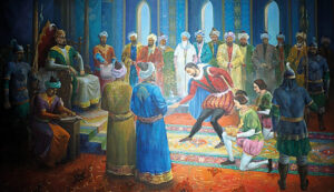 “…Nazarimda, ulug' amir xuddi hashamatli uy bo'sag'asida o'ltirganday tuyuldi menga. U shohsupa ustida o'ltirardi. Uning oldidagi favvora ichida qizil olmalar suzib yurardi. Ulug' amir lo'labolishga yonboshlagan holda shoyi ko'rpacha ustida o'ltirardi. Podshohning egnida gulsiz silliq shohi yaktak, boshida uzun telpak, telpakning tepasida qizil yoqut, javohir va boshqa qimmatbaho toshlar qadalgan”. Shundan keyin qabul bilan bog'liq rasm-rusumlarning batafsil bayoni keltiriladi: “Elchilar podshohni ko'rishlari zahoti o'ng oyoqlarida tiz cho'kib, qo'llarini ko'ksiga qo'yib ta'zim qildilar. Keyin bir oz yaqinlashib, yana ta'zim qildilar, so'ng tiz cho'kib turdilar. Ulug' amir ularning o'rinlaridan turib, yaqinroq kelishlarini aytdi. Mulozim podshohga yaqinroq borishga istihola qilib, elchilarning qo'llarini qo'yib yubordi”.