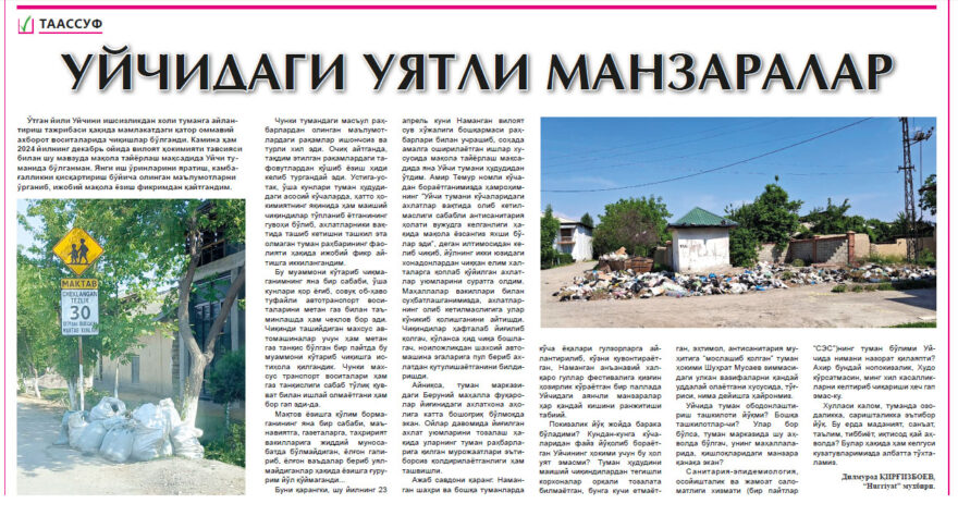 “Hurriyat” gazetasining 2025 yil 30 aprel sonida yoritilgan “Uychidagi uyatli manzaralar” maqolasi tuman hokimligida mutasaddi tashkilotlar rahbarlari ishtirokida muhokama qilinib, tegishli chora-tadbirlar belgilandi.