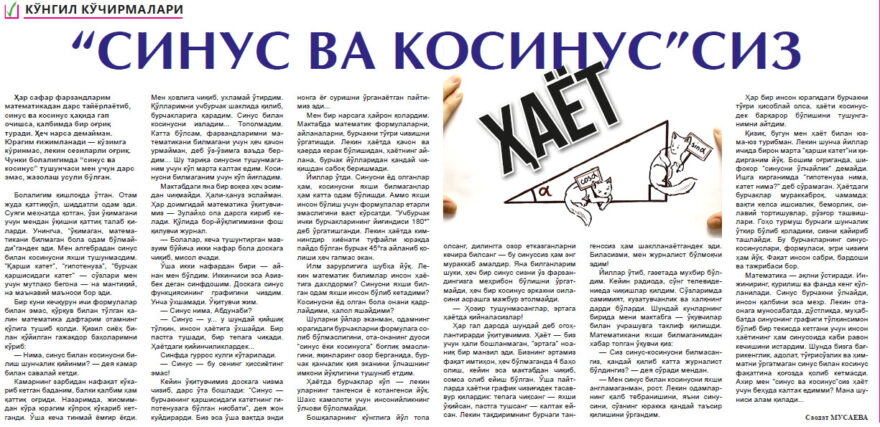 “Hurriyat” gazetasining shu yil 16 iyul 28-sonida boshqa qiziqarli maqolalar qatori muallif Saodat Musayevaning “Sinus va kosinussiz hayot” sarlavhali mushohadali maqolasini o'qidim.