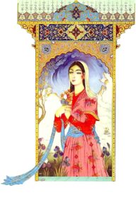 Севги ёшидаги Гулбаданнинг латиф чеҳраси. Андижонлик отасининг истаги бўлса керак, дуррачани фарғонача ўраб олган. Қулоғидаги ёқут зиракларнинг ўткир нурларидан унинг ҳусни, меҳр ва эҳтиросга тўла кўзлари жозибалироқ, кўркамроқ. У чуқур ўйга ботган бу дамда хушбичим, марғилонча атлас кўйлаги сарв қоматини таъкидлаб туришини ҳам илғаб оламиз. Қалин соч танғиб олинган дуррача ёнларидан мўралаб, нафис қулоқларни ўраб олишга шай эди. Гулбадан: