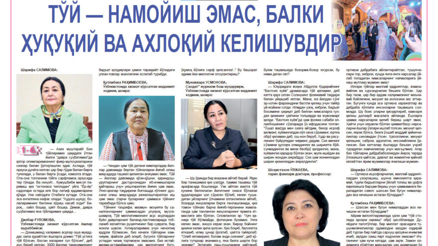Таниқли шоира Шарифа Салимованинг 2026 йил 14 январда “Hurriyat” газетасидаги “Тўй – намойиш эмас, балки ҳуқуқий-ахлоқий келишувдир” сарлавҳали мақоласини ўқиб, қуйидаги фикрларимни ёзяпман.
