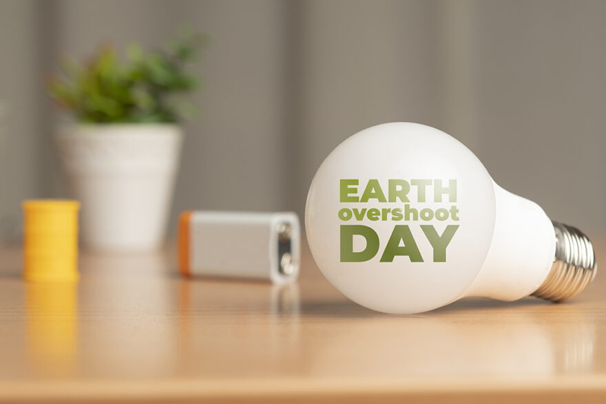 Earth overshoot day concept: light bulb, a battery and an oil barrel on a wooden table