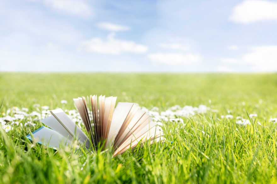 Open book on green grass in a field with daisys background concept for reading, relaxing and recreation