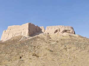 …Ҳайдовчи машинани ўт олдирди. Бироз қиздиргач, қўзғалди. Элликқалъа тумани маркази Бўстон шаҳридан чиққан улов шимолий йўналишга қараб ўттиз-ўттиз беш чақирим юрганидан сўнг, аввал яйдоқ чўл, салдан кейин Қизилқум этаклари пешвоз чиқди. Тоғ ва азамат тепаликлар кўзга ташланди. Улкан харсангтошдан ҳосил бўлган тик деворли чўққи ҳам, унинг устига бир юз эллик, бир юз олтмиш метрча баландликда бир замонлар ­бунёд этилган қалъа қолдиқлари ҳам олисдан элас-элас кўзга ташланади. Хаёлдан Аёзқалъанинг то шу кунга қадар етиб келганининг ўзи ҳам катта гап, деган ўй кечди. Қалъа тепасига пиёда чиқдик. Бироз нафасимизни ростлагач, чор-атрофга нигоҳ ташладим. Ана, қалъадан унча узоқ бўлмаган Қулқалъа, Қирққизқалъа, Девқалъа, Ёнбошқалъа, Қўйқирилган қалъа, Гулдурсинқалъа, Элликқалъа сингари элликка яқин қалъалар ястаниб ётибди. Хуллас, рассом асарларида тасвирланган барча манзарани кўриш мумкин.